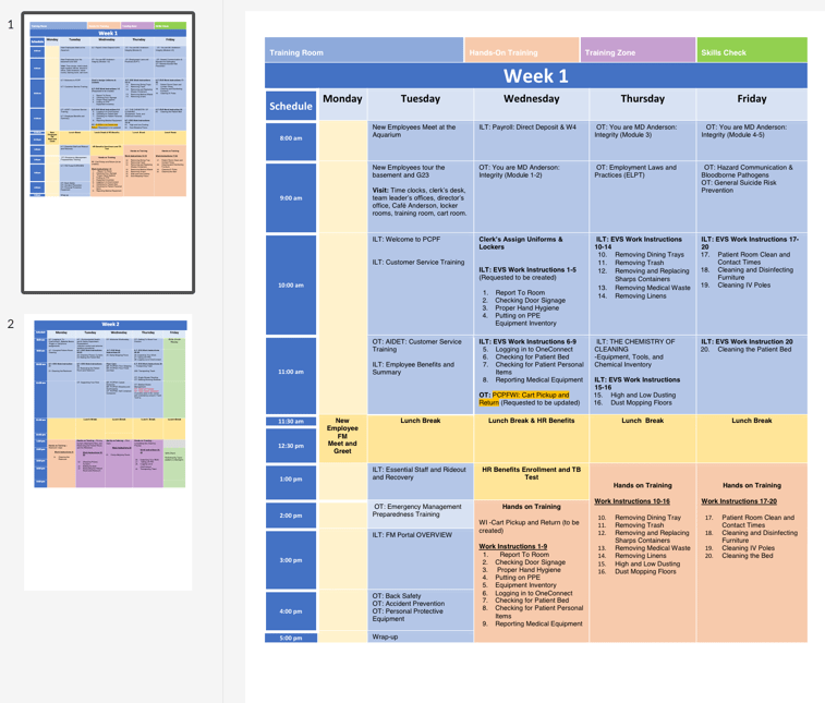 Detailed two week onboarding schedule. Purple section signifies hands on training.