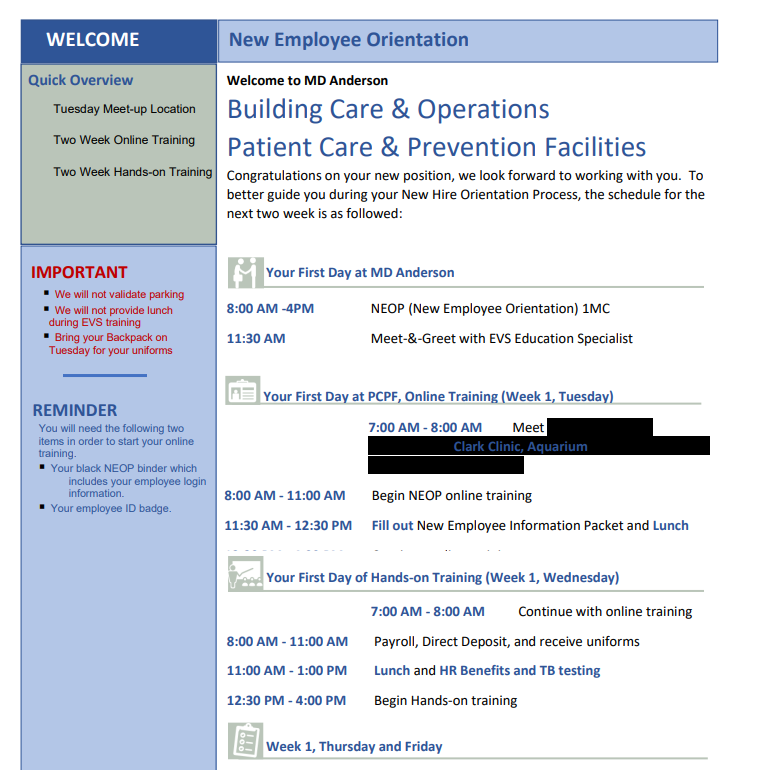 Onboarding was a rigorous 2 week process. I took many pictures to help facilitated training, created a detailed schedule, and a badge insert with all the important information and contact numbers.